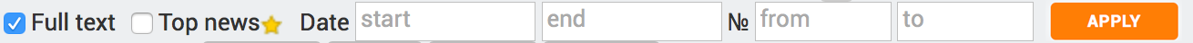 The rubricator with settings for work with the array of full-text business articles. Separate fields include: search area / industry sector / source / date / country / RF federal district / world region / main / personalities / personal lists / mark / favorites. For a detailed study of the rubcitaor you should head over to the Tour page.