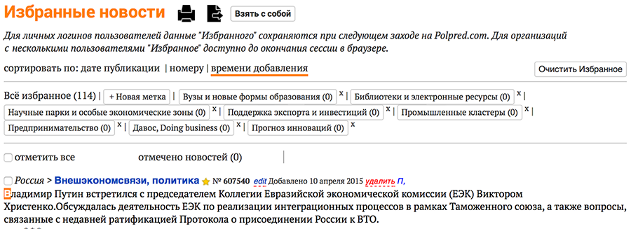 In addition to the rubricator, there are two other tools — Favorites and Personal lists for the work with the polpred text arrays. Access to Favorites is available via the panel under the rubricator (the panel remains at the top of the screen even during the page scrolling).