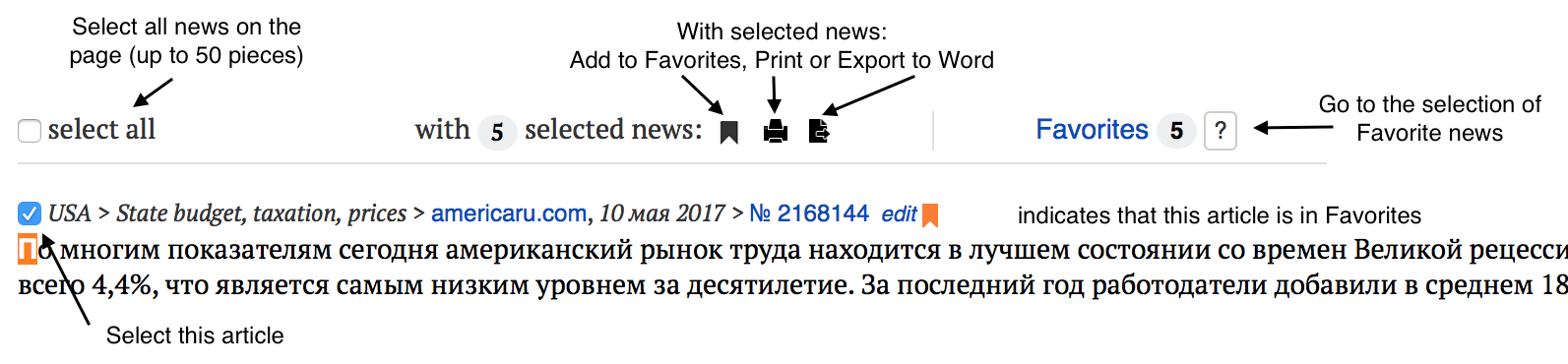 on the control bar, the news item will be added to a special selection of news. And if you choose the «mark all» check mark, all news items on the page will be marked.